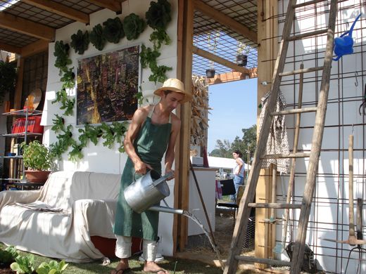 À l’intérieur, vivent quatre comédiens qui jouent des personnes volontaires pour vivre l’expérience de l’Appartement Cultivable, à la fois pour faire progresser la recherche et pour servir de démonstration et donc de sensibilisation pour le public du Salon.